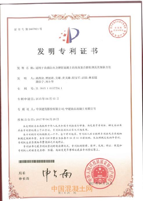 近日,中建西部建設所屬中建商砼技術成果“適用于高強自應力鋼管混凝土的高效復合膨脹劑及其制備方法”獲國家發明專利授權。