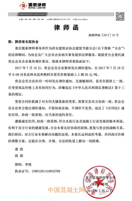 律師函稱,2017年7月10日,陜西省水泥協會會員企業集體發出調價通知,自2017年7月10日早8:00對各水泥和熟料在原有價格基礎上上調50元/噸。企業在同一時間發出調價通知,且漲幅相同,甚至在措辭上一致,在變更商品價格上具有協同行為,涉嫌違反《中華人民共和國反壟斷法》第十三條的規定。