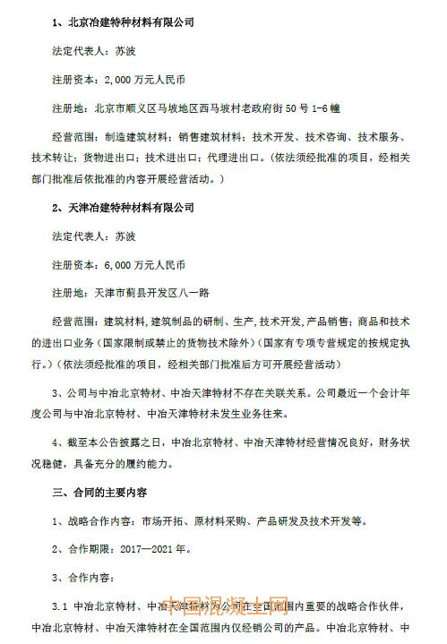 中冶北京特材、中冶天津特材是中冶建筑研究總院有限公司直屬工程材料專(zhuān)業(yè)的研發(fā)生產(chǎn)單位,總投資8,000萬(wàn)元。其憑借雄厚的技術(shù)研發(fā)能力和嚴(yán)格的質(zhì)量管理體系,已發(fā)展成為國(guó)內(nèi)最專(zhuān)業(yè)的建筑工程材料研發(fā)和生產(chǎn)供應(yīng)商,技術(shù)及產(chǎn)品涵蓋混凝土起砂處理和修補(bǔ)、混凝土阻銹和防腐、清水混凝土保護(hù)、混凝土表面處理和結(jié)構(gòu)補(bǔ)強(qiáng)、混凝土外加劑等領(lǐng)域。本著合作共贏、優(yōu)勢(shì)互補(bǔ)的原則,雙方經(jīng)友好協(xié)商,同意在外加劑市場(chǎng)開(kāi)拓、原材料采購(gòu)、技術(shù)研發(fā)等方面建立長(zhǎng)期的戰(zhàn)略合作關(guān)系。