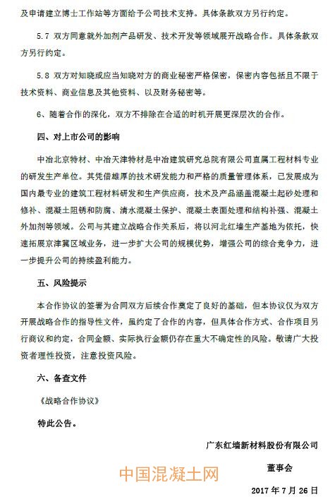 紅墻股份2017年7月26日公告,近日,公司與北京冶建特種材料有限公司、天津冶建特種材料有限公司簽署《戰(zhàn)略合作協(xié)議》,本著合作共贏、優(yōu)勢(shì)互補(bǔ)的原則,雙方經(jīng)友好協(xié)商,同意在外加劑市場(chǎng)開(kāi)拓、原材料采購(gòu)、技術(shù)研發(fā)等方面建立長(zhǎng)期的戰(zhàn)略合作關(guān)系。