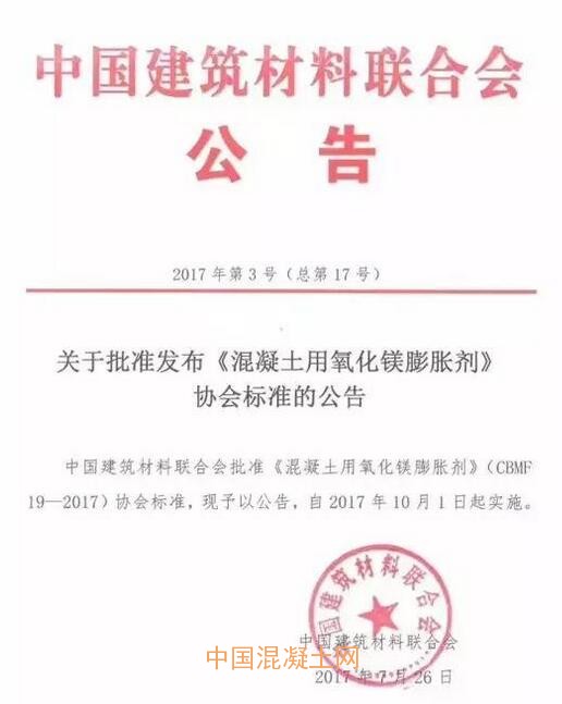 日前,中國建筑材料聯合會發布公告,批準發布《混凝土用氧化鎂膨脹劑》(CBMF19-2017)協會標準,該標準將自2017年10月1日起正式實施。