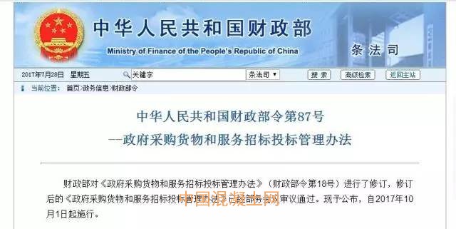 第八十八條 本辦法自2017年10月1日起施行。財(cái)政部2004年8月11日發(fā)布的《政府采購貨物和服務(wù)招標(biāo)投標(biāo)管理辦法》(財(cái)政部令第18號(hào))同時(shí)廢止。