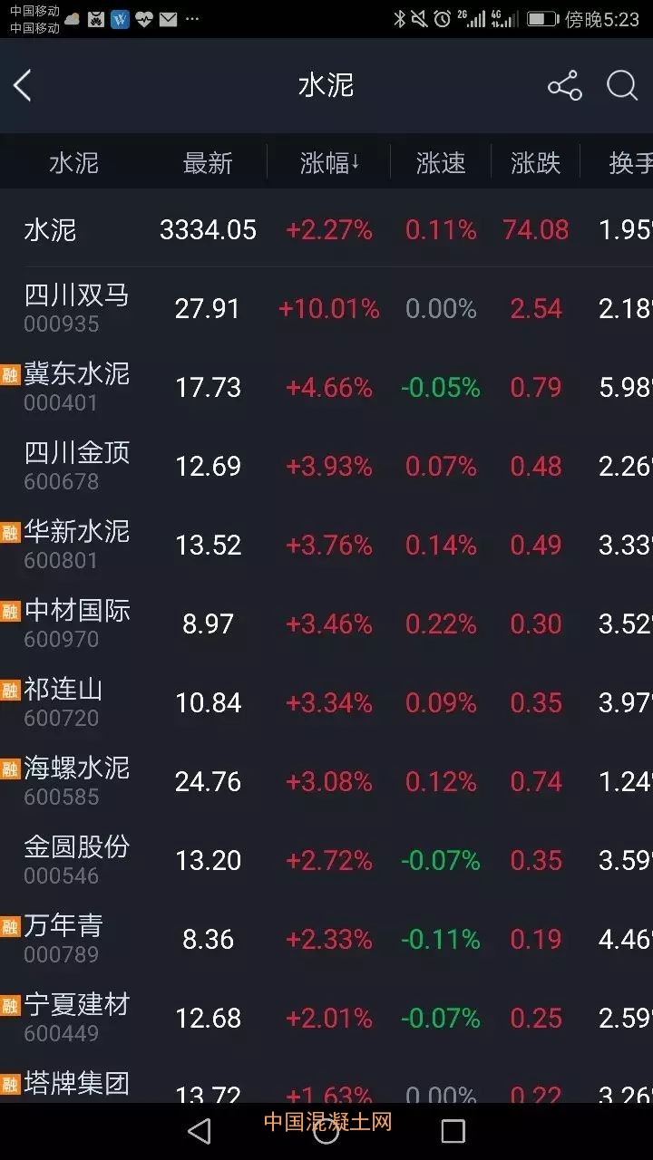 9月13日,水泥股票集體發力,截至收盤,四川雙馬漲停,已經連續兩天漲停,冀東水泥大漲4.66%,四川金頂、華新水泥、中材國際、祁連山和海螺水泥漲幅在3%以上。