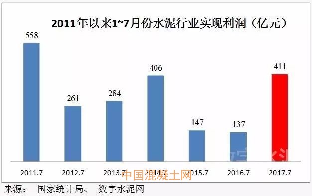 四川雙馬業績靚麗只是水泥行業的一個縮影。國家統計局數據顯示,2017年1-7月份,全國水泥行業累計實現利潤411億元,同比增長200%。其中,7月單月實現利潤77億元,累計以及單月數據均創歷史第二新高(峰值為2011年)。