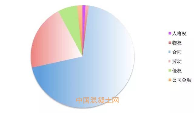 為分析混凝土行業(yè)的主要涉訴情況,首先需要對(duì)當(dāng)事人進(jìn)行鎖定。在數(shù)據(jù)庫(kù)中含有“混凝土”關(guān)鍵詞的涉訴當(dāng)事人案件總量為84528件,其中民事案件80893件。