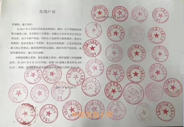 近日,江蘇大部地區混凝土價格出現較大幅度上漲,個別地區漲幅達50元/方。15日,無錫34家混凝土企業聯名發布《告用戶書》,稱自2017年9月份以來,水泥連續系調價,黃砂、石子等原材料價格大幅度上漲,并且供應十分緊張,混凝土行業各企業已無法正常運作,處于半停產狀態,同時由于原材料大幅度漲價,供應日趨緊張,混凝土企業資金十分緊張,靠企業內部挖潛,已無法保證混凝土的正常供應。隨著原材料供應緊缺,隨時有停產的危險。