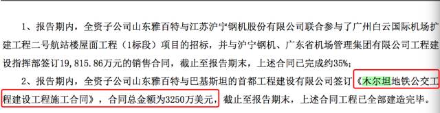 雅百特在2015年報中提及,公司全資子公司山東雅百特與巴基斯坦的首都工程建設有限公司簽訂《木爾坦地鐵公交工程建設工程施工合同》,合同總金額3250萬美元(約合2.12億元人民幣)。