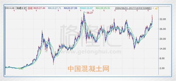 同樣是在2010下半年,海螺水泥的H股股價達到歷史峰值,36.27港元。