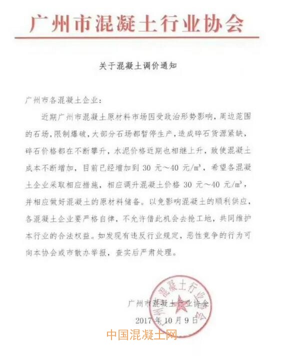 近期廣州市混凝土原材料市場因受政治形勢影響,周邊范圍大部分石場都暫停生產,造成碎石貨源緊缺,碎石價格不斷攀升,水泥價格也相繼上漲,致使混凝土成本不斷增加,目前已經增加到30-40元/方。對此,廣州市混凝土行業協會發文,希望各混凝土企業相應調升混凝土價格30-40元/方,并做好混凝土原材料儲備,以免影響混凝土的順利供應。