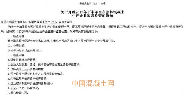 本次檢查將組建專家組進行監督檢查,對檢查中發現的違法違規行為及存在的問題,將現場下達《青島市預拌混凝土生產企業整改通知書》,并依據《青島市預拌混凝土生產企業信用考核辦法》作出處理。檢查將于10月25日結束。