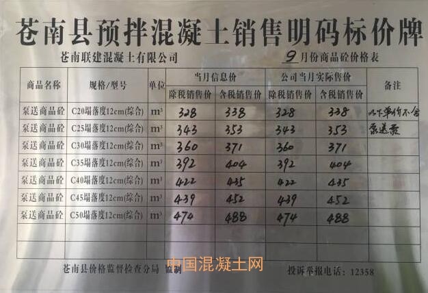 為規范蒼南縣預拌混凝土市場的價格秩序,理順市場價格行為,蒼南縣發改局根據國家發改委《關于商品和服務實行明碼標價的規定》的要求,就蒼南縣各預拌混凝土公司銷售的商品砼價格要實行明碼標價制度。各公司要在顯著位置對銷售的產品進行明碼價格,對各種標號的預拌混凝土實行一標一價制度,同時對當月的市場信息價予以公布。