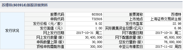 根據交易所公告,江蘇蘇博特新材料股份有限公司于2017年10月31日進行網上和網下申購。本次發行股份數量為7,600萬股,本次發行僅發行新股,不進行老股轉讓。回撥機制啟動前,網下初始發行數量為4,560萬股,約占本次發行數量的60.00%;網上初始發行數量為3,040萬股,占本次發行總量的40.00%。
