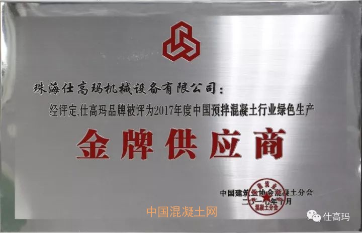 珠海仕高瑪公司憑借著其“低能耗、低噪音、高效率”的產品性能和優良的攪拌機品質在本次大會上榮獲“2017年度預制混凝土行業綠色生產金牌供應商”。