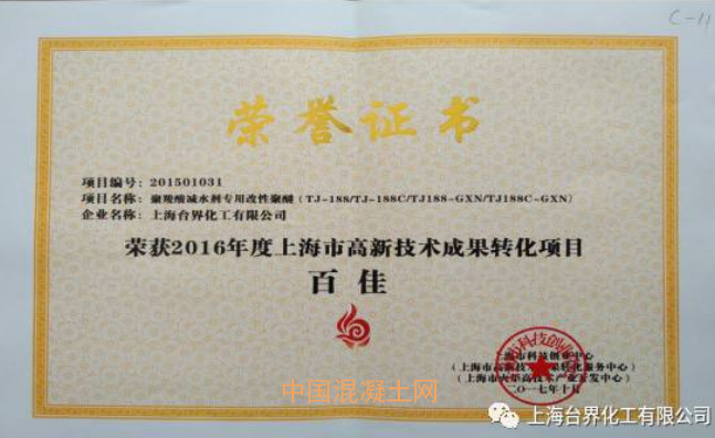 金秋十月,上海臺界化工有限公司在合作單位和地方政府的大力支持下迎來碩果——企業榮獲“2016年度上海市高新技術成果轉化項目百佳”獎!