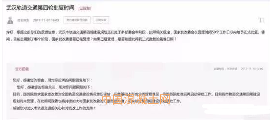 日前,一則武漢市發改委關于城市地鐵的回復引起大家的關注,武漢市發改委在回復中表示,國家要求國家發改委對全國軌道交通建設情況重新評估,在此基礎上行程分類管理意見,待國家批準后再啟動審批工作。具體內容見下圖: