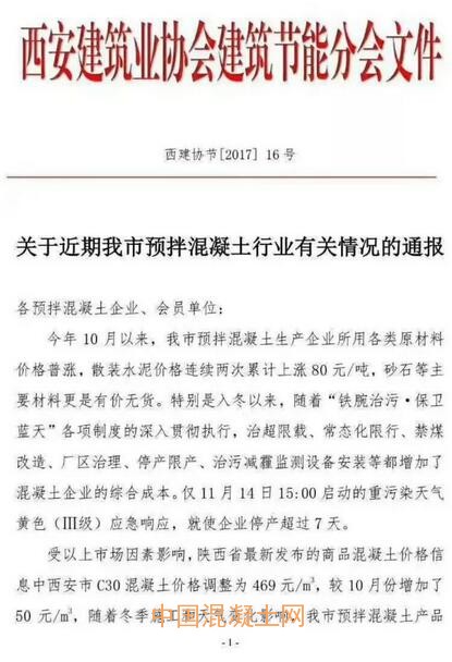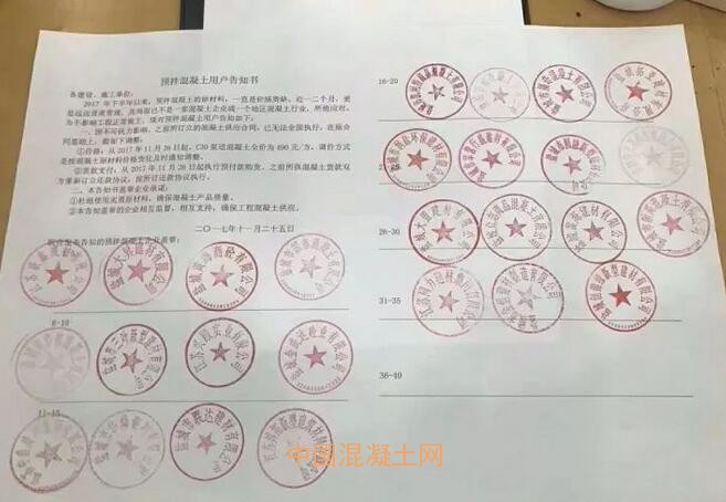 1、之前所簽訂混凝土供應合同已無法執行,自11月26日起,C30混凝土價格調整為460元每方,調價方式將按混凝土原材料市場價格因素變化及時通知。