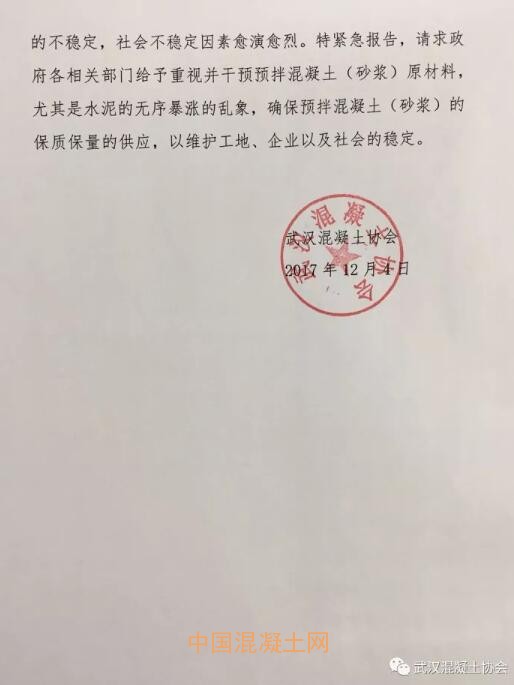 武漢混凝土協會4日發布《關于請求政府干預水泥等建材價格暴漲亂象的緊急報告》(下稱報告),報告稱:近半年以來,受環保治理的影響,碼頭整治,礦山河砂限采,水泥執行錯峰停窯生產,導致武漢及周邊地區預拌混凝土(砂漿)原材料價格暴漲。