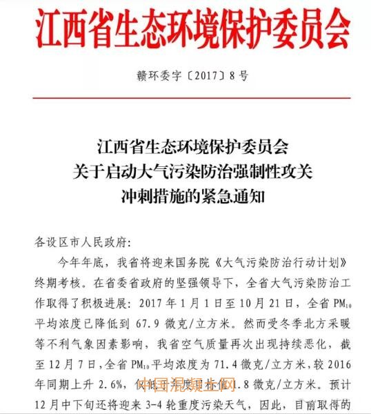 近日,江西省生態環境保護委員會發布《關于啟動大氣污染防治強制性攻關沖刺措施的緊急通知》,要求從12月11日至31日期間,采取大氣污染防治強制性管控措施,所有混凝土攪拌站、瀝青攪拌站(應急搶險搶修工程、政府批準的重大民生工程以及省政府調度的重點工程除外)全部停產。