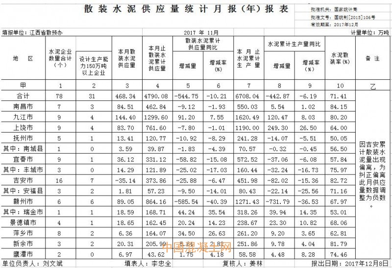 2017年1-11月江西省散裝水泥供應情況