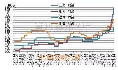 2017年水泥價格在年初市場尚未完全恢復,前兩月受淡季及過節(jié)等客觀因素影響,局部價格持續(xù)下滑,三月上旬起,市場開始回暖,加之環(huán)保停產(chǎn),原材料上漲等影響,水泥價格一路上行,尤其是長三角地區(qū),水泥價格已經(jīng)迎來數(shù)次調(diào)漲。市場行情持續(xù)走高至5月下旬稍顯疲態(tài),華東市場價格出現(xiàn)小幅下跌,隨后6月南方市場提前進入雨季,水泥需求逐漸下滑,多地籌劃停窯限產(chǎn),在停產(chǎn)的支撐下,價格下滑未成大范圍趨勢,僅海南地區(qū)月內(nèi)三次下滑水泥價格,跌幅達百元,成行情變動最大地區(qū)。7-8月正值雨季,天氣不佳,工程啟動較少,水泥需求低迷,水泥價格持續(xù)下探至8月中旬后,隨著市場環(huán)保力度加大,市場停產(chǎn)增多,水泥市場逐漸進入上行通道,并至9月市場進入傳統(tǒng)旺季,市場行情持續(xù)好轉(zhuǎn),水泥價格漲價行情全面開花,直至12月份漲價行情依舊不減,市場價格攀升幅度趕超10年行情,長三角地區(qū)熟料價格突破500元/噸大關(guān),水泥價格奔向600元/噸,多地漲幅達200元/噸。