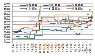 中南市場:中南地區(qū)水泥市場17年整體呈現(xiàn)震蕩上行的態(tài)勢,一季度市場整體大穩(wěn)小動,二季度兩廣漲跌互現(xiàn),河南漲漲跌跌,變化不斷,海南地區(qū)受外來低價水泥沖擊,月內(nèi)三次下滑價格,跌幅達百元,成月內(nèi)變動最大區(qū)域。8月后期市場開始回溫,價格不斷上探,直到12月份,中南地區(qū)均有大幅漲幅,漲價完成好幾輪。河南地區(qū)11月中旬開始停窯,導致市場價格一度破5,兩湖表現(xiàn)更為強勁,多次大幅度漲價。