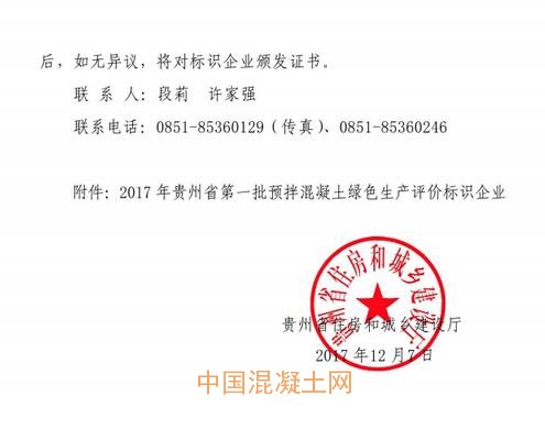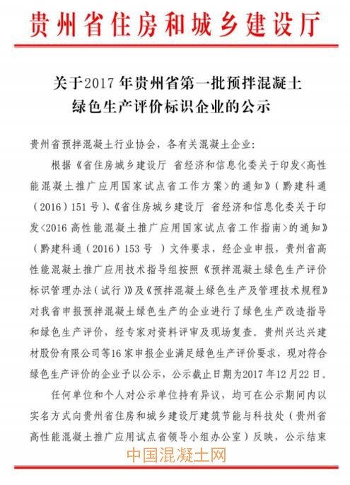 經(jīng)企業(yè)申報,貴州省高性能混凝土推廣應(yīng)用技術(shù)指導(dǎo)組按照《預(yù)拌混凝土綠色生產(chǎn)評價標識管理辦法(試行)》及《預(yù)拌混凝土綠色生產(chǎn)及管理技術(shù)規(guī)程》對貴州省申報預(yù)拌混凝土綠色生產(chǎn)的企業(yè)進行了綠色生產(chǎn)改造指導(dǎo)和綠色生產(chǎn)評價,經(jīng)專家對資料評審及現(xiàn)場復(fù)查,貴州興達興建材股份有限公司等16家申報企業(yè)滿足綠色生產(chǎn)評價要求,現(xiàn)對符合綠色生產(chǎn)評價的企業(yè)予以公示。