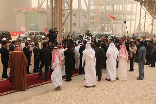 中材集團總經理譚仲明、中材國際董事長劉志江、總裁王偉及沙方高管人員陪同胡主席考察,中沙兩國員工在現場熱烈歡迎胡錦濤主席。