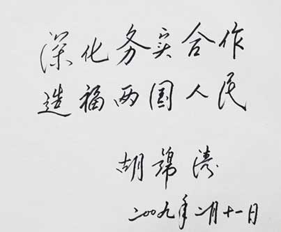 正在沙特訪問的中國國家主席胡錦濤,當地時間上午10時20分抵達中材集團旗下中材國際總承包建設的沙特利雅得水泥廠(RCC)參觀。胡主席詳細詢問了工廠的技術水平及生產情況,對中材集團的發展表示充分肯定,并勉勵中材“要繼續堅持科技創新,發揮自身優勢,擴大海外市場份額”??疾旖Y束時,胡錦濤主席欣然為中材題詞:“深化務實合作,造福兩國人民。”
