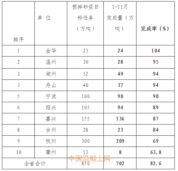 1-11月,杭州等10市預拌砂漿全年目標任務完成情況如下: