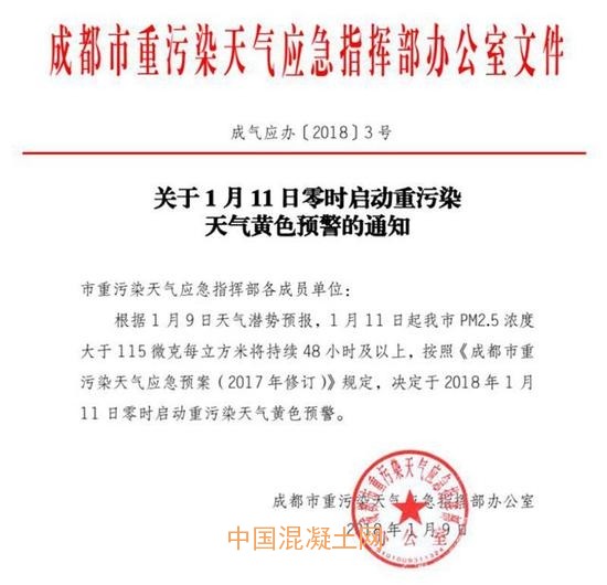 記者從成都市重污染天氣應急指揮部辦公室獲悉,根據1月9日天氣潛勢預報,1月11日起成都市PM2.5濃度大于115微克每立方米將持續48小時及以上,按照《成都市重污染天氣應急預案(2017年修訂)》規定,決定于2018年1月11日零時啟動重污染天氣黃色預警。這也意味著,各項減排措施也將從1月11日零時開始執行,屆時國三以下排放的汽油車及國三以下排放的柴油車禁止在繞城內通行,限行時間延長為早6點至晚10點。