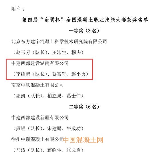 比賽流程分為理論知識筆試和指定條件下的現場競技兩大版塊,比賽日程安排緊湊,內容形式豐富,對參賽選手的專業知識、實踐操作、臨場應變和綜合素質都有著全面考察。隨著賽事最終力學性能結果的公布,繼去年獲得全國混凝土職業技能比賽一等獎的優異成績之后,今年中建西部建設湖南有限公司代表隊再次憑借扎實的技能功底和出色的比賽發揮,一舉包攬大賽一等獎和理論知識第一名的好成績。