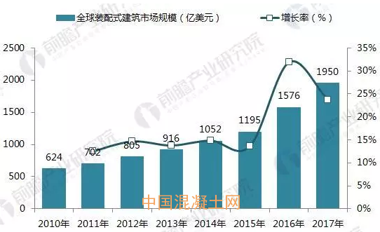 根據前瞻產業研究院發布的《2018-2023年中國住宅產業化發展模式與投資戰略規劃分析報告》數據顯示,2016年全球裝配式建筑市場規模1576億美元,較上年大幅增長30%以上,主要是由于中國市場的快速發展,2016年中國裝配式建筑市場規模增長率達到150%。2017年初步測算,全球裝配式建筑市場規模達到近2000億元。