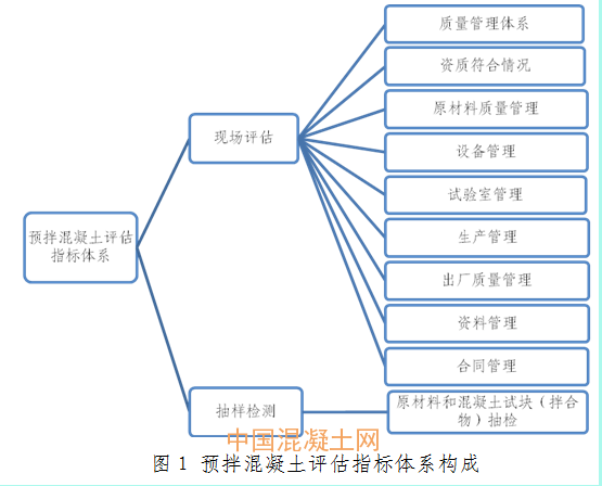 評估的主要內容分為質量管理體系、資質符合情況、原材料管理、設備管理、試驗室管理、生產管理、混凝土出廠質量管理、資料管理、合同管理以及抽樣檢測(具體情況見圖1),共計10個方面,包含一級指標48個,二級指標145個,三級指標278個,總分為100分。同時,依據2017年四季度專項執法檢查情況,對存在違法違規行為的企業進行扣分。