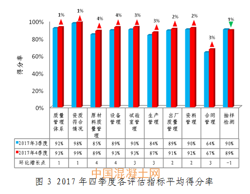 本季度除抽樣檢測得分率較上季度小幅下降外,其他評估指標得分率均有不同程度提高。原材料質量管理和設備管理得分率較上季度提升幅度較大,為4個百分點;抽樣檢測得分率下降主要是由于原材料抽檢得分率下降了2.5個百分點,而試塊(拌合物)抽檢得分率較上季度提高0.6個百分點,達到98.7%。具體情況見圖3。
