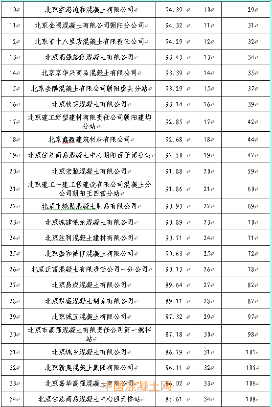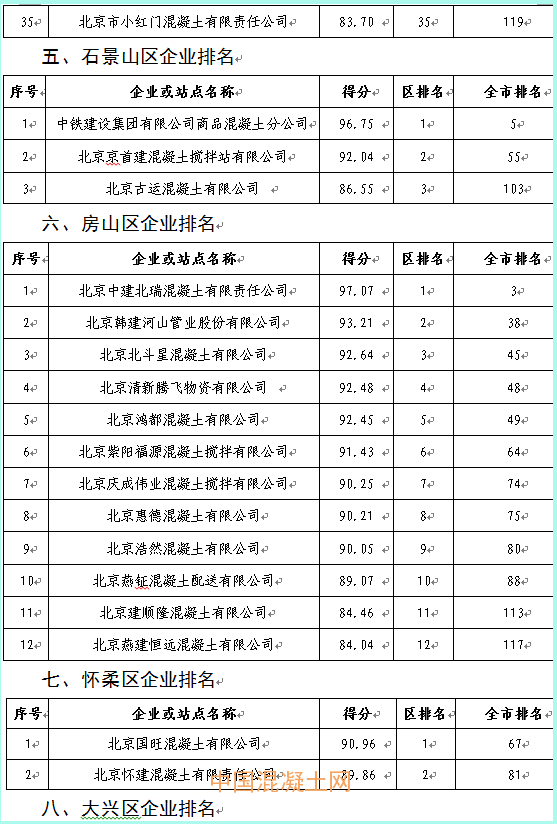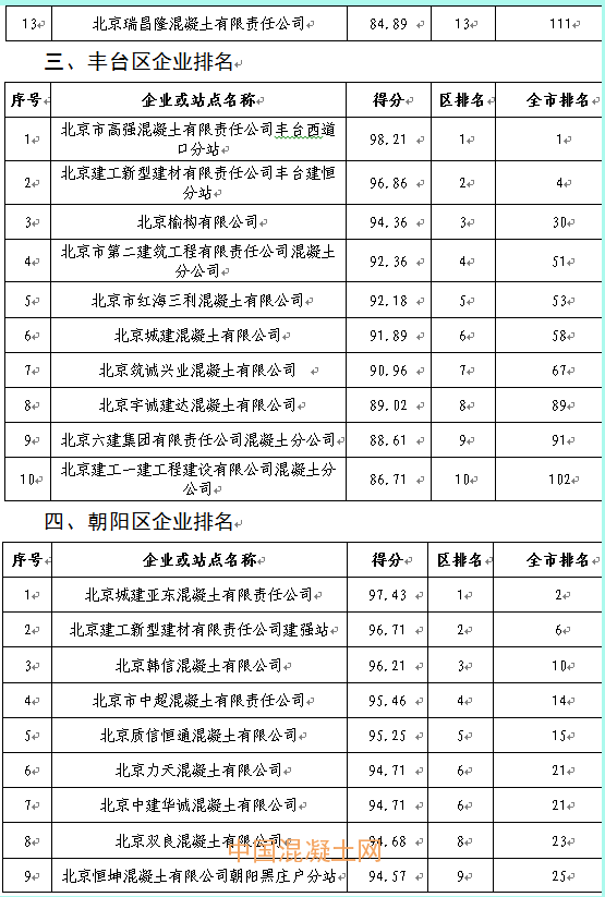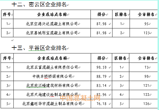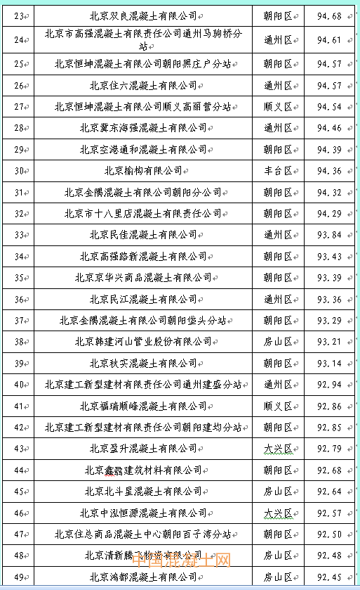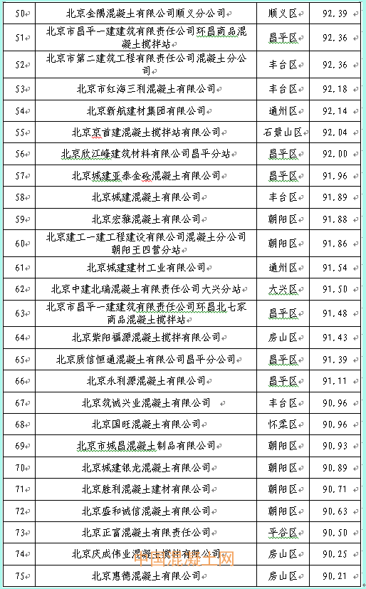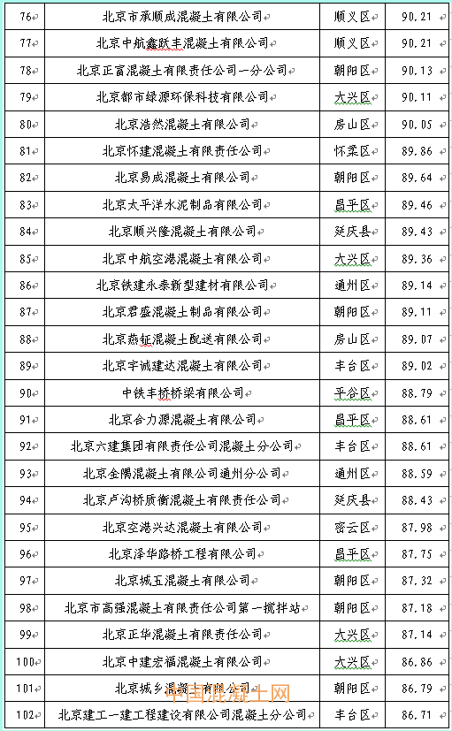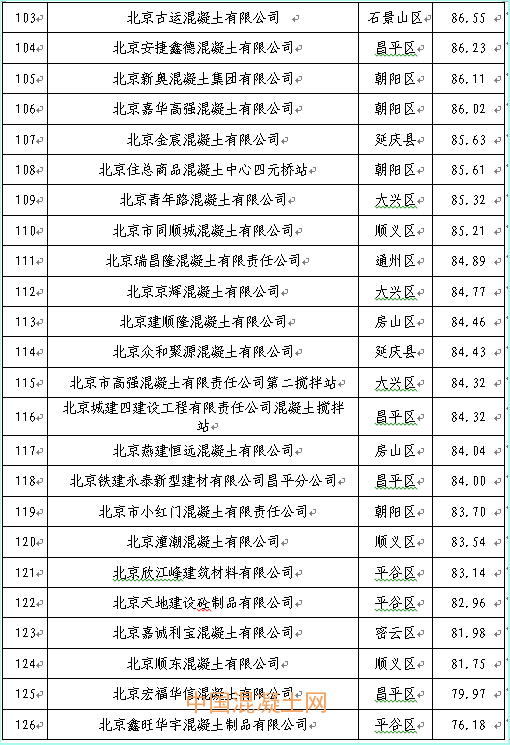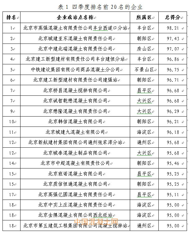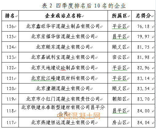 本季度得分最高的企業為北京市高強混凝土有限責任公司豐臺西道口分站98.21分,得分最低的企業為北京鑫旺華宇混凝土制品有限公司76.18分,全市混凝土企業得分排名詳見附件2。