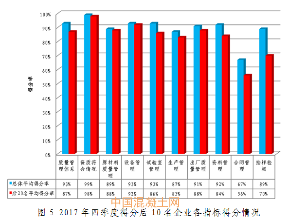 后10名企業得分區間為76.18-84.04分(見表2),平均得分為82.13分。與全市企業平均得分率相比,得分率較低主要在資料管理、合同管理,以及抽樣檢測等方面(見圖5)。其中,北京燕建恒遠混凝土有限公司已連續3個季度排名全市后10名,北京嘉誠利寶混凝土有限公司、北京宏福華信混凝土有限公司以及北京市小紅門混凝土有限責任公司已連續2個季度排名全市后10名。