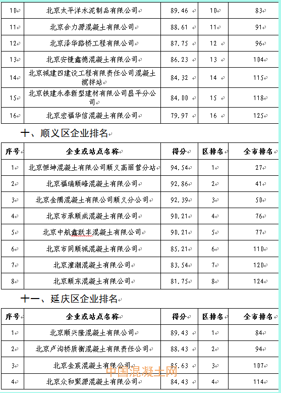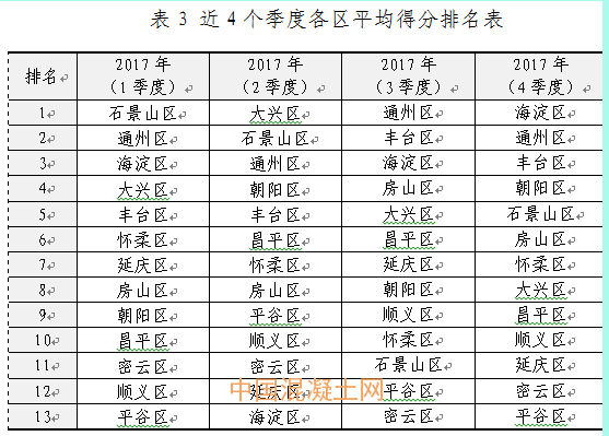 按126家混凝土企業所屬的13個轄區進行評估分析,四季度評估平均分前5名的區為:海淀區、通州區、豐臺區、朝陽區、石景山區。其中通州區已連續5個季度排名全市前3名,豐臺區已連續4個季度排名全市前5名,石景山區本季度得分排名提升明顯。評估平均得分后3名的區為:延慶區、密云區、平谷區,其中平谷區和密云區已連續5個季度排名靠后(近4個季度各區平均得分排名見表3)。本季度各區企業得分排名見附件3。