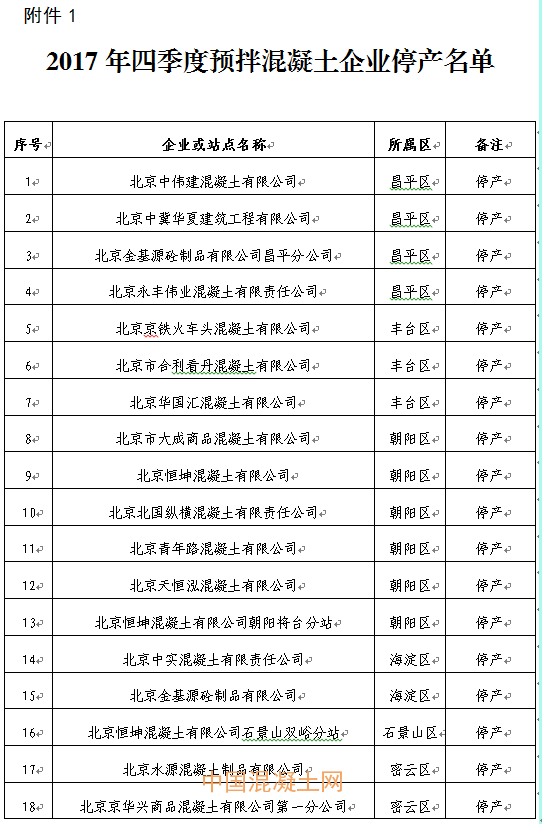 附件:1.2017年四季度預拌混凝土企業停產名單