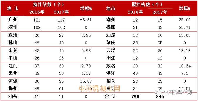 表1為2016、2017年廣東省各市預拌混凝土攪拌站數(shù)量統(tǒng)計情況(僅統(tǒng)計有資質經(jīng)營的站點,不含在建站點)。