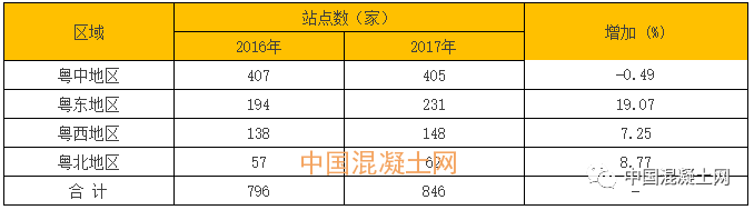 表2 2016、2017年廣東省各區(qū)域攪拌站站點數(shù)同比增長情況