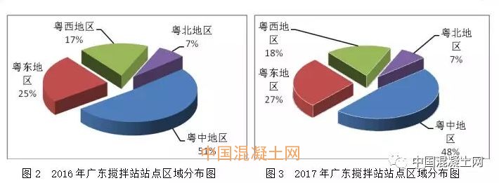 粵中地區(qū)攪拌站數(shù)量占全省48%,呈逐年下降的趨勢(2012年為66%、2013年為59%、2014年為56%、2015年為53%、2016年為51%)。圖2、圖3分別為2016年、2017年廣東各區(qū)域攪拌站站點數(shù)區(qū)域分布情況。