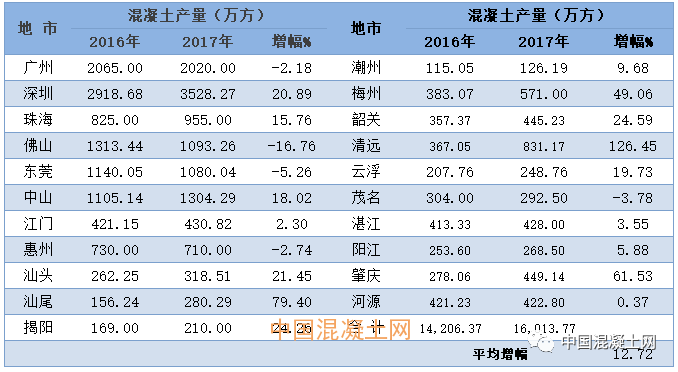 表3:2016、2017年廣東省各市預拌混凝土產量統(tǒng)計 (單位:萬立方米)