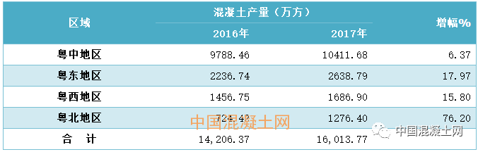 表4 2016、2017年廣東省各區(qū)域預拌混凝土產量同比增長情況