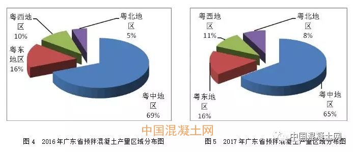 在經(jīng)濟較發(fā)達的粵中地區(qū),預拌混凝土的產量占全省總產量的65%,較2016年的69%有所下降。2016年、2017年各市預拌混凝土產量及區(qū)域情況分別見圖4、圖5所示。