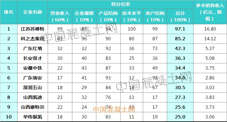 中國混凝土網此次評選出的外加劑企業綜合十強是經多方調查統計,搜集了國內大型重點外加劑企業的銷售收入、企業規模等數據,以2017年各企業實際銷售額為依據,經過對各項數據的權重比較得出最終排名。數據主要來自各外加劑企業上報、企業年報以及政府審計報告。