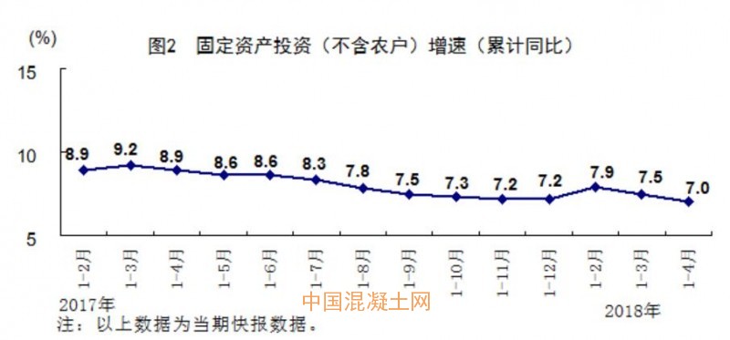 2018年1-4月份,全國(guó)固定資產(chǎn)投資(不含農(nóng)戶(hù))15.44萬(wàn)億元,同比增長(zhǎng)7%,增速較一季度回落0.5個(gè)百分點(diǎn),低于去年同期1.9個(gè)百分點(diǎn)。從環(huán)比速度看,4月份固定資產(chǎn)投資(不含農(nóng)戶(hù))增長(zhǎng)0.52%。