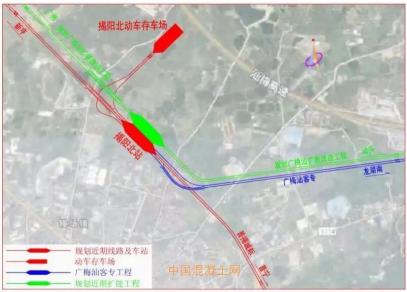 規劃廣梅汕擴能改造工程在揭陽北設地面站,規劃城際鐵路的揭陽北 站在西側緊鄰并行設站,規劃潮汕機場-揭陽南-揭陽北城際線和潮汕至龍 湖南聯絡線接入城際場,城際場北端連接揭陽北動車運用所??土魍ㄟ^站 廳換乘。見圖 6-3-4。
