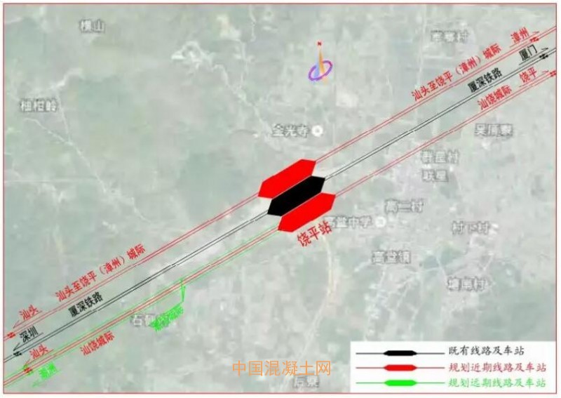 既有饒平站為廈深鐵路既有中間站,位于地面。規劃汕頭-饒平(漳 州)、汕頭-饒平南、潮州-饒平 3 條城際線 5 個方向引入本站,建議規劃分 設客專場和城際場 2 個車場,其中汕頭至饒平(漳州)城際引入客專場(客 專場位于既有饒平站北側緊鄰并行設置),規劃汕頭-饒平南城際、潮州- 饒平共 2 條線路接入城際場(城際場位于既有饒平站南側緊鄰并行設置)。 客流通過地下通道或站廳換乘。見圖 6-3-6。