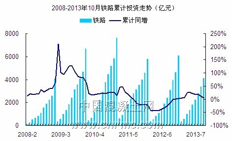 2013年1-10月,鐵路基建投資累計達4095億元,累計同比增長4.17%;據中國鐵路總公司發布的最新數據顯示,今年1-11月,全國鐵路基建投資4483億元,同比增長3.8%;全國鐵路固定資產投資5113億元,同比增長0.9%;11月,鐵路基建投資達648億元,相比去年同期的701億元,同比下降7%。雖說當月鐵路基建投資同比有所下降,但并不影響我國鐵路基建的發展速度與態勢,鐵路建設將迎來投資高峰期,鐵路建設具有一定的逆周期性。當經濟下行時,基礎設施建設是最好的對沖工具,而鐵路已成為政府在基建中的首選品種。