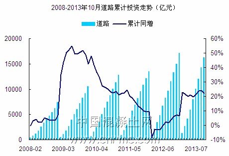 道路投資累計達16244億元,累計同比增長22.03%,當月投資為1985億元,同比增長10.78%。從今年的總體情況來看,道路投資情況與去年的投資量相比較,上漲幅度較明顯。我國中西部目前公路建設還處于低密度期,還存在較大的建設空間。2013年穩增長基調持續,中央或將支持公路建設,且2012年基數較低,公路建設增速或持續反彈。中國混凝土網預計在2014年中,公路等基建行業仍會充當穩定經濟增長的重要組成部分。